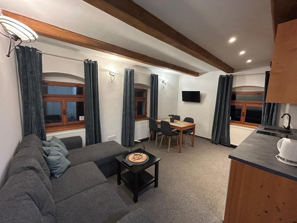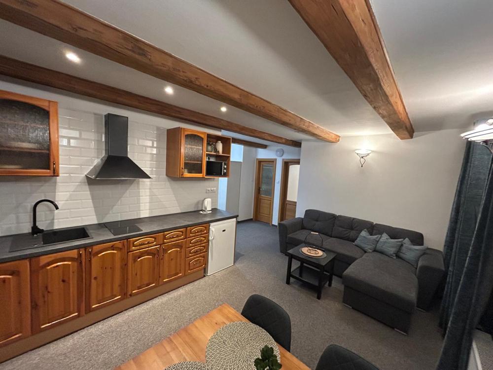 Kapacita 2+2 osoby, předsíňka, ložnice dvoulůžko 160 cm a dvě lůžka 90 cm, obývací pokoj s posezením, vybavená kuchyňka, vlastní koupelna, ručníky a toaletní potřeby, fén, plochá TV. Ke každému apartmánu náleží parkovací místo v uzavřeném areálu (pro přímé rezervace parkování zdarma).