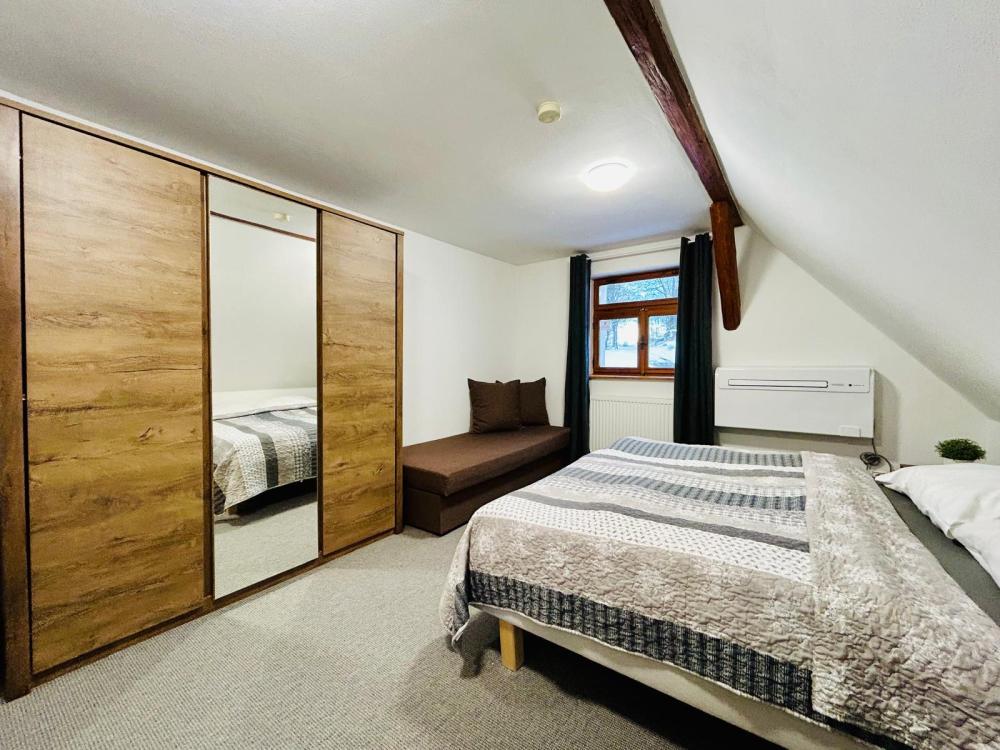 - Typy postelí: 1x Manželská postel, 2x Samostatná postel, 1x Rozkládací pohovka