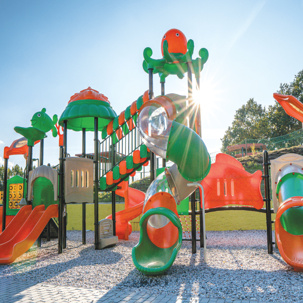 Ráj pro děti, plný skákacích hradů, prolézaček a herních atrakcí, které zaručují hodiny zábavy a pohybu v bezpečném prostředí.